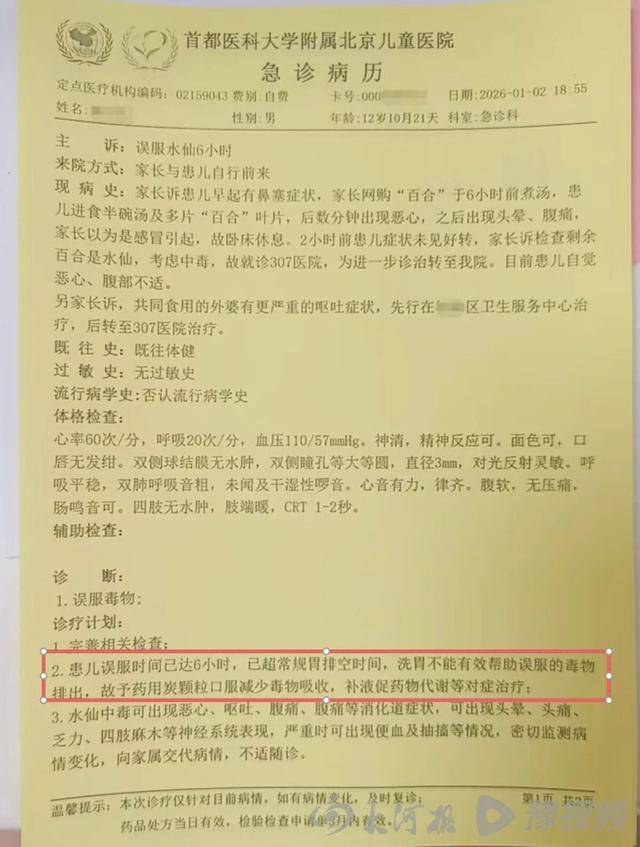 APP采办的鲜百合,被配送员误配送为剧毒水仙种球,导致家中71岁的母亲和12岁的儿子食用后中毒送医。邹密斯供给的图片显示,该水仙种球包拆盒盖较大,侧面有“水仙种球养护”字样,但因盒盖遮挡不易被发觉,其母亲正在签收时未能辨识。误食后,白叟取孩子呈现严沉中毒症状。目前,白叟身体仍十分虚弱,后续健康影响需持续察看。据邹密斯引见,1月2日上午,她用盒马APP正在野阳区的盒马mini黄寺店下单采办鲜百合。收到货后,其母亲将配送来的两个“百合”种球煮汤食用,不久后即呈现猛烈头疼、等症状。包拆盒盖为通明,仅盒子侧面不显眼处有“水仙种球养护”字样,白叟未能识别。