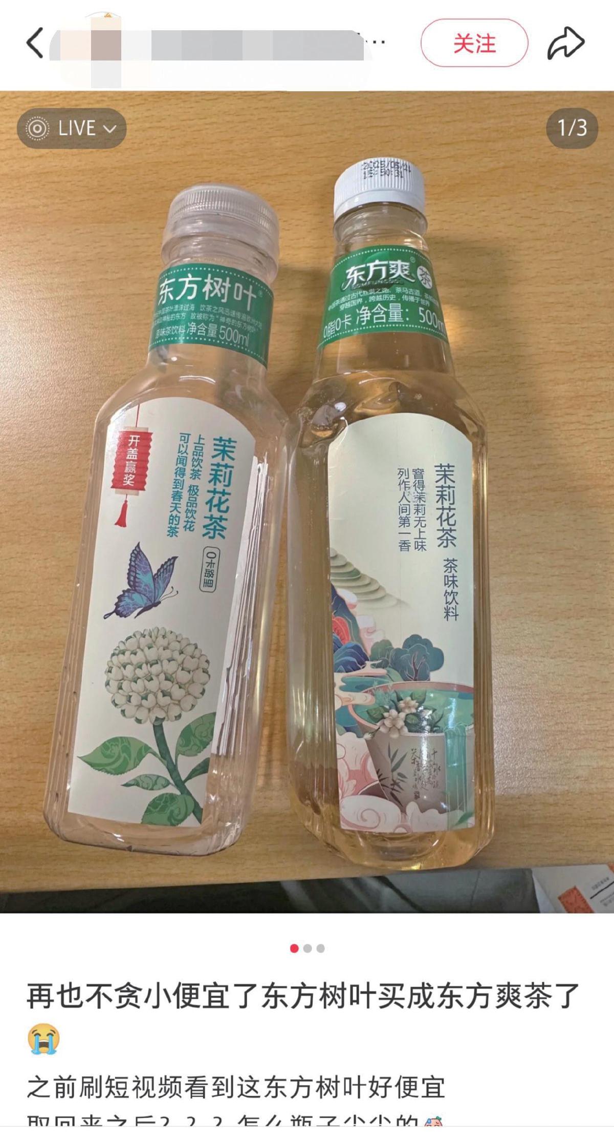 一位消费者正在社交平台发文吐槽,称本人买到了取农夫山泉旗下无糖茶品牌东方树叶高度类似的“东方爽茶”。社交平台截图。